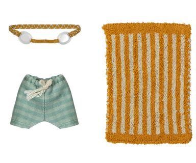 Vacation time! This set includes all essential accessories for a fun day at the beach: a bathing suit, sunhat, and a towel. It all fits the mice in...