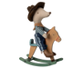 Saddle up for endless fun with the Maileg Little Brother Cowboy Mouse on Rocking Horse! Dressed in jeans, a scarf, and a cowboy hat, this tiny wrangler is ready to ride into adventure. Notice the clever little tail hole on the horse—details that make playtime all the more special for the curious and observant. Perfect for sparking imaginative play and cowboy daydreams!